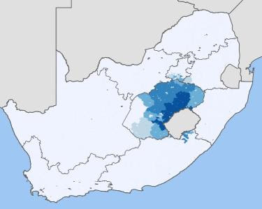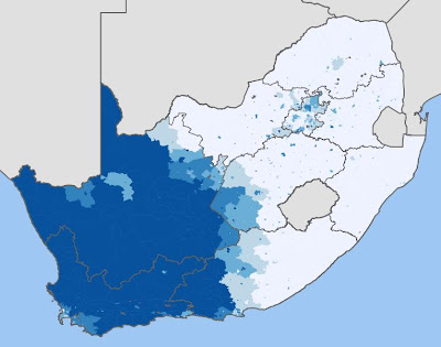 Apartheid, também é a terceira língua materna mais falada na África do Sul (13,3% da população) e que é largamente maioritária (acima) nas regiões sudoeste do país.
