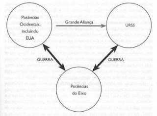 Retirados de um livro qualquer, eis três esquemas da evolução do sistema de alianças globais ao longo da Segunda Guerra Mundial, reproduzindo as posições em 1939, as redefinições de 1941 e as conclusões depois de 1945. Trata-se de exemplares daqueles meios pedagógicos auxiliares que será forçado criticar mas para os quais, sinceramente, nunca se vê grande utilidade...