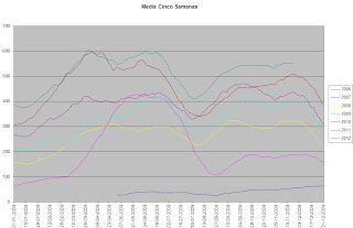 Também nos blogues, com a veterania chega o conhecimento das rotinas. Ao aproximar-se o fim do ano a frequência do Herdeiro de Aécio tradicionalmente diminui. Abaixo, pode ver-se um gráfico com a evolução da média móvel de cinco semanas de visitas desde 2006. Que diminui no fim dos anos por causa do Natal…mas também por causa do Verão. É que mais de 55% de quem cá vem é brasileiro. Especialmente para eles, como escreveria Vinícius de Morais, Saravá!