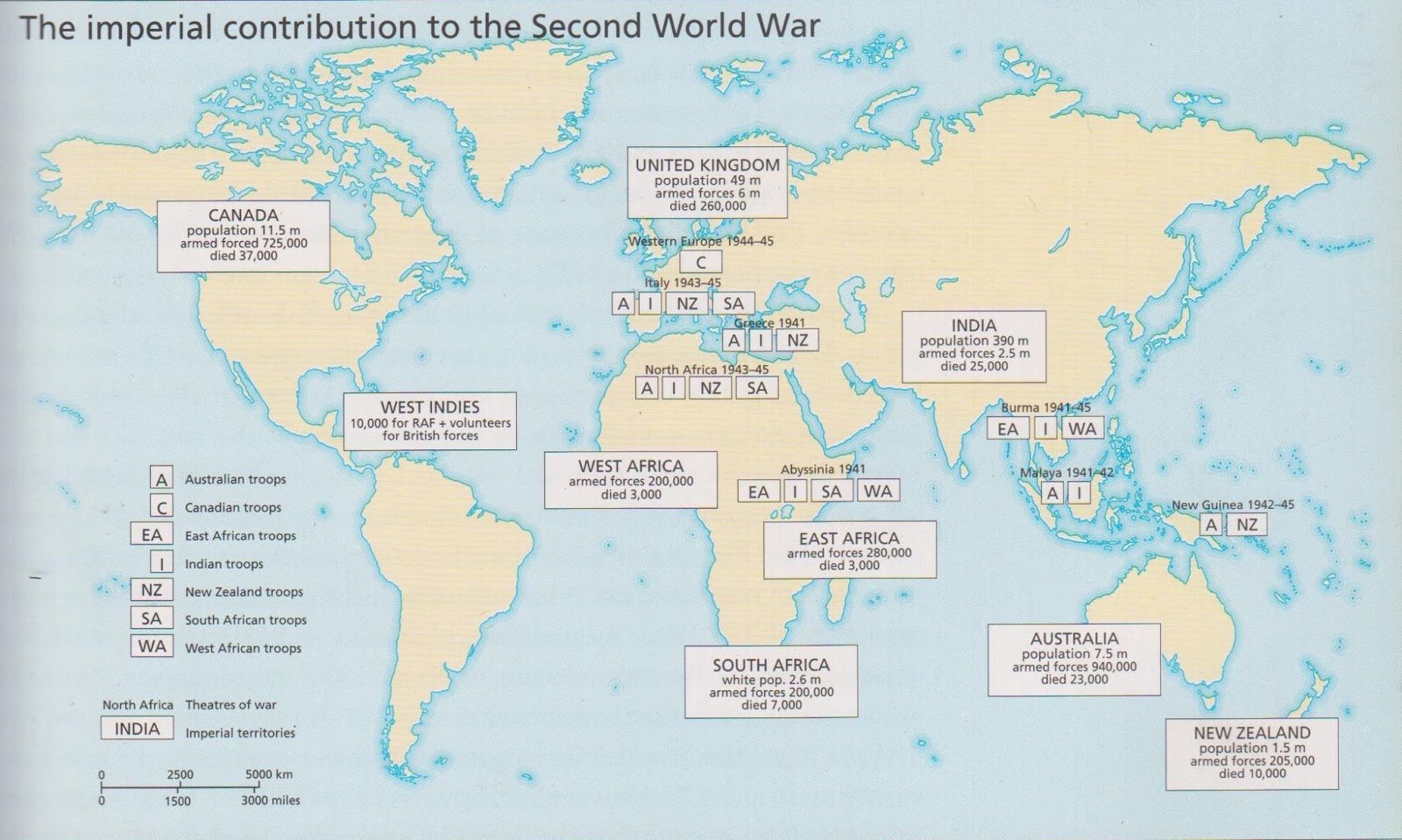 Porém, neste caso, tem de se comparar os mais de 11 milhões de mobilizados pelo Império Britânico com os mais de 12 milhões que foram mobilizados pelos soviéticos assim como outros tantos que o foram pelos norte-americanos. À luz desta contabilidade, o Reino Unido tinha agora uma posição equiparada no quadro das grandes potências vencedoras do conflito. Além disso, fragilizando-a, a fantasia da unidade política dos membros do Império dissipara-se quando Austrália, Índia ou Nova Zelândia se haviam visto alvo de ameaça de invasão japonesa, quando o assunto não era prioridade para a metrópole. Abaixo, numa fotografia de conjunto que, cada vez mais, não passava disso mesmo, uma fotografia de conjunto, e da esquerda para a direita, vêem-se os primeiros-ministros do Canadá, da África do Sul, do Reino Unido, da Nova Zelândia e da Austrália em Londres em Maio de 1944.