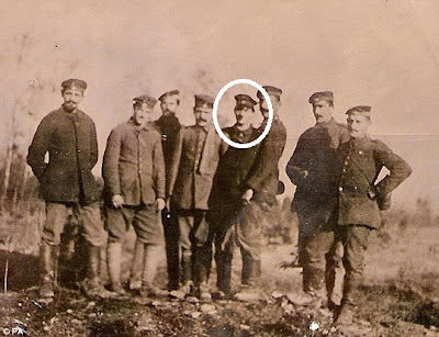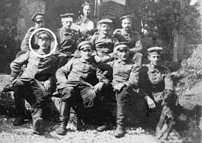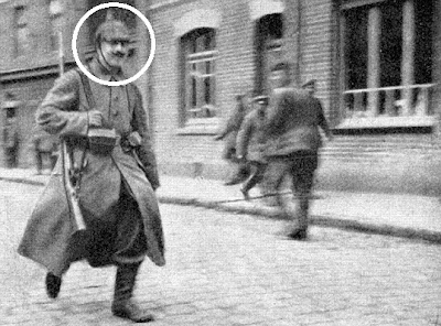 Corroborando que haveria alguma pose da sua parte, há nestas duas fotografias, a imediatamente acima e abaixo, algo que sugere aquele retrato psicológico de quem se exibe por não conviver directamente com o perigo. Era um fenómeno conhecido das nossas Guerras em África que os soldados que mais se dispunham a enviar fotografias suas de camuflado e G-3 para a família eram aqueles que não precisavam de os usar em situações de stress, porque não iam para o mato. Acima, Hitler é o único dos soldados daquele abrigo mal iluminado a deixar-se fotografar de capacete (pickelhaube) posto e abaixo mostra-se prazenteiro para fazer um serviço que, atendendo ao enquadramento urbano, só poderá ser de sentinela. Todavia, o mais provável é que as condições em que servia tivessem ido mudando: em Outubro de 1916, com dois anos de frente, Hitler foi ferido numa perna, atingido por um estilhaço de artilharia.
