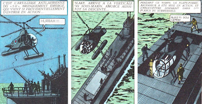 Suponho que devem ter sido muitos os que, como eu, se devem ter maravilhado quando viram pela primeira vez a associação de aeronaves auxiliares com submarinos, aumentando as capacidades destes últimos – acima são desenhos do álbum O Segredo do Espadão (1947) de Edgar Pierre Jacobs. Aliás, a ideia de associar os dois sistemas de armas surgiu cedo, quase em simultâneo com a dos porta-aviões, ainda durante o decurso de Primeira Guerra Mundial (1917).