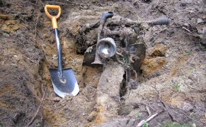 Munidos de detectores de metais, os modernos caçadores de tesouros russos conseguem assim desenterrar do solo tesouros militares como não se encontram em mais lado algum, neste caso uma moto da Wehrmacht que possivelmente terá sido engolida inteira pela lama de uma rasputitsa de há 70 anos, durante a Segunda Guerra Mundial. Os meus conhecimentos sobre motos são poucos, mas parece-me tratar-se de uma BMW ou de uma Zündapp.