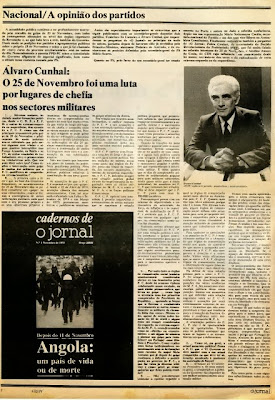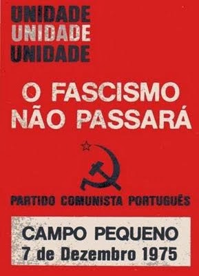 Vale a pena recordar através de documentos da época como é que os comunistas procuraram descalçar a bota, dissociando-se dos acontecimentos do 25 de Novembro de 1975, apesar da esmagadora maioria da opinião pública de então os considerar os grandes derrotados na ocasião. Na edição de 5 de Dezembro de O Jornal (acima, clicar para ampliar). Álvaro Cunhal descrevia os acontecimentos como uma luta por lugares de chefia nos sectores militares e os cartazes mandados imprimir para um comício do partido a ter lugar em 7 de Dezembro (abaixo), apontavam para o extremo oposto do espectro político, apelavam à unidade, uma imensa unidade, no propósito de não deixar passar o fascismo. Contudo, hoje, a esmagadora maioria dos veteranos comunistas já não se lembram destes requintes de dissimulação e tornaram-se óbvios no significado que dão às datas, confrontando um 25 de Abril que nos é apresentado por eles repleto de pureza em contraste com um 25 de Novembro hediondo. É engraçado como, nessa classificação primária se esquece, que no caso reverencial da Rússia, onde também houve duas Revoluções, a data que os comunistas de todo o Mundo sempre relevaram foi a segunda, a de Outubro, quando os seus camaradas russos alcançaram o poder e nunca a inicial, a de Fevereiro que assinalava o derrube do czarismo. É apenas mais um dos insondáveis mistérios da dialéctica marxista-leninista que cá em Portugal aconteça precisamente o contrário.