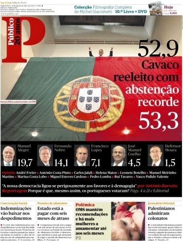 Na verdade, a informação que tanto gosta de se lamentar pelos condicionalismos que lhes impõem antes dos actos eleitorais, parece-me responsável pela parcialidade do tratamento dos resultados depois desses actos, nomeadamente quando o assunto envolve os votos em branco, aqueles que não produzem espectáculo. Tome-se um outro exemplo, ainda mais flagrante, o das eleições presidenciais de 2011. Aí, ainda houve mais eleitores a votar em branco: 191.300 (4,26%). Mas esse protesto discreto foi mediaticamente ofuscado pelo da votação no candidato palhaço José Manuel Coelho que até recebeu uma votação ligeiramente inferior: 189.100 votos. Confirme-se abaixo o tratamento marginal concedido aos votos em branco na 1ª página de um jornal do dia seguinte. Durante décadas, não ir votar, inutilizar voluntária ou involuntariamente o voto¹ ou votar em branco teve a mesma consequência prática. Só recentemente pessoas com responsabilidade na formação do regime se pronunciaram por reformas nos métodos eleitorais, casos de Jorge Miranda ou de Freitas do Amaral, contemplando nomeadamente a questão dos votos em branco. Percebe-se o que os assusta. Mas creio que já vêm tarde de mais: o aparelho mediático já está tão focalizado no espectáculo que se tornou num adversário de quem procure promover a dignidade desse método de protesto cívico. Mais do que pelo valor do voto, pela sua repercussão, há que reconhecer que a melhor forma de dar visibilidade ao desagrado com as opções eleitorais disponíveis já não é votar em branco: é votar no candidato que prometa partir a loiça toda…