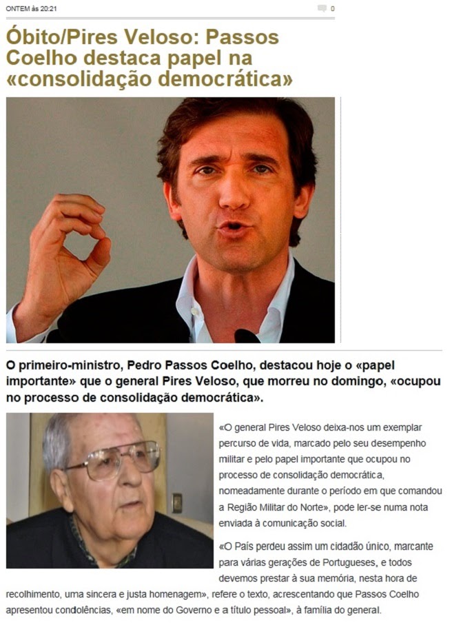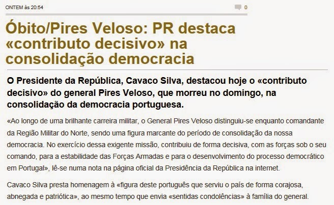 Há um excelente poema em língua inglesa, composto durante a Segunda Guerra Mundial (veja-se mais abaixo), que se intitula Simplify Me Whem I'm Dead (Simplifiquem-me Quando Morrer). Mas não será decerto nesse género de simplificação que os assessores encarregados da redacção do pão-com-manteiga dos comunicados, tanto os de Cavaco Silva (acima), como os de Passos Coelho (abaixo), terão pensado quando se esmeraram em quase se copiarem nos clichés constantes das notas que enviaram para a comunicação social em que, em nome das duas figuras, assinalam o falecimento do general Pires Veloso (1926-2014). Comparando-as e avaliando-as, quase apetece dizer que seria preferível morrer num outro anonimato mediático a ver-se publicamente evocado em tais notas medíocres, tão transparentes no frete, tão falhas de espírito, tão desprovidas de respeito.