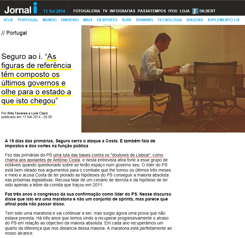 Na semana passada António José Seguro deu uma entrevista ao jornal i onde procura realçar o seu lado de provinciano em confronto contra uma intelectualidade lisboeta hegemónica mas ineficaz que ele considera estar a apoiar maioritariamente o seu rival António Costa nas primárias do PS. Na retaliação, como que por acaso, reapareceu na net o destaque a um vídeo já com ano e meio de antiguidade, onde os mais distraídos poderão perceber as razões da incompreensível ausência de críticas do PS a Miguel Relvas mesmo depois de ele se tornar motivo de escárnio e um alvo político frágil e apetecível. O que eu acho despropositado nestas disputas são as canduras de quem apela consecutivamente à elevação nos debates: ou está a ser hipócrita ou está a ser ingénuo e aí o melhor que tem a fazer é ir procurar, a tal de elevação, noutras actividades.