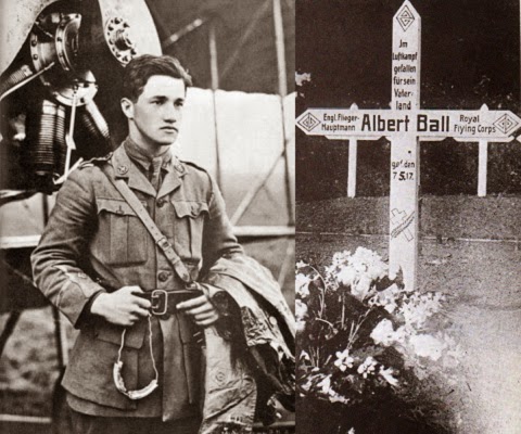De entre as minhas fotografias favoritas da Primeira Guerra Mundial, há esta do ás (aviador) britânico Albert Ball que não viveu para celebrar o seu 21º aniversário, apesar de até lá ter registado 44 vitórias no ar desde Março de 1916 até à sua morte em combate a 7 de Maio de 1917, sobre território controlado pelo inimigo que o enterrou (vejam-se os dizeres da cruz). Mas existe um ar impressionantemente juvenil no herói que, ao mesmo tempo que o engrandece para figuração no panteão, nos impede de aceitar totalmente a sério as consequências do que fez e do que lhe foi feito, imaginando que cem anos passados, e num mundo menos cruel como hoje, ele pudesse não ter passado de mais um daqueles jovens associais viciados em jogos de computador - alguns deles em que se abatem virtualmente inimigos como Ball fazia.