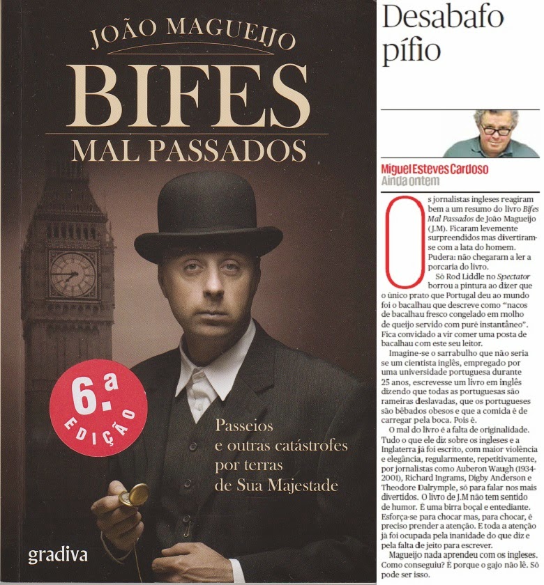 Confesso que só fui comprar e ler o Bifes Mal Passados por ter começado a ler demasiados comentários negativos e distanciadores a respeito do livro. O comentário de Miguel Esteves Cardoso foi um desses casos, embora aqui se perceba que ele adopte a mesma equidistância que um outro Miguel, o Sousa Tavares, tem vindo a dar mostras no que se refere aos problemas financeiros do seu compadre Ricardo Espírito Santo. E é até mais desculpável: a mãe do Miguel Esteves Cardoso é bifa, o que o torna num semi-bife, e com isso um suspeito óbvio de falta de isenção na apreciação de um livro que se farta de dizer mal deles todos – bifes. O livro, publicado vai para três meses , tornou-se num sucesso editorial (seis edições!), comprovando o quanto o escárnio e o maldizer ainda medra entre nós. Quanto à minha opinião sobre a obra supra, retive que o autor, João Magueijo, escolhe sempre o osso da canela para arriar, o que retira ao(s) agredido(s) a possibilidade de dissimular, pretendendo que a crítica fora amena, o autor dela é que fora desastrado na violência como arriou. Por isso os Bifes Mal Passados, naquela sua crueza quase em sangue, não têm a elegância descritiva que torne o livro uma obra superior. Mas pelo menos existe o lado positivo de que, neste caso, os próprios visados – os bifes! – constataram o quanto podem não ser apreciados pelos de cá. João Magueijo está no seu direito de escrever uma crítica de 180 páginas dos bifes que não os represente a todos e que até possa ser classificada literária e sociologicamente como uma merda. Em 1997 um humorista inglês chamado Steve Coogan inventou uma personagem que era uma outra (merda) a pretexto de um cantor pimba português (de ficção) chamado Tony Ferrino (abaixo), que até ganhou - finalmente! - o Eurofestival, e não me lembro que alguém por cá o tenha severamente desancado por nem todos nos reconhecermos no estilo pimba. Se, na mesma linha do argumento acima apresentado por Miguel Esteves Cardoso, até houve jornalistas bifes de gema como Auberon Waugh (1939-2001) que troçaram dos seus compatriotas com mais verve e humor do que Magueijo, nos por cá também temos humoristas semi-alemães (por cá estabelecidos como Herman Krippahl) que criam personagens pimbas como Tony Silva que resultam muito mais conseguidas que o que o outro Tony, o Ferrino, Tanto assim que, com o desportivismo que os bifes apregoam mais do que exercem, até passámos essa outra merda de Tony, o Silva, na nossa televisão para nos rirmos com ela...