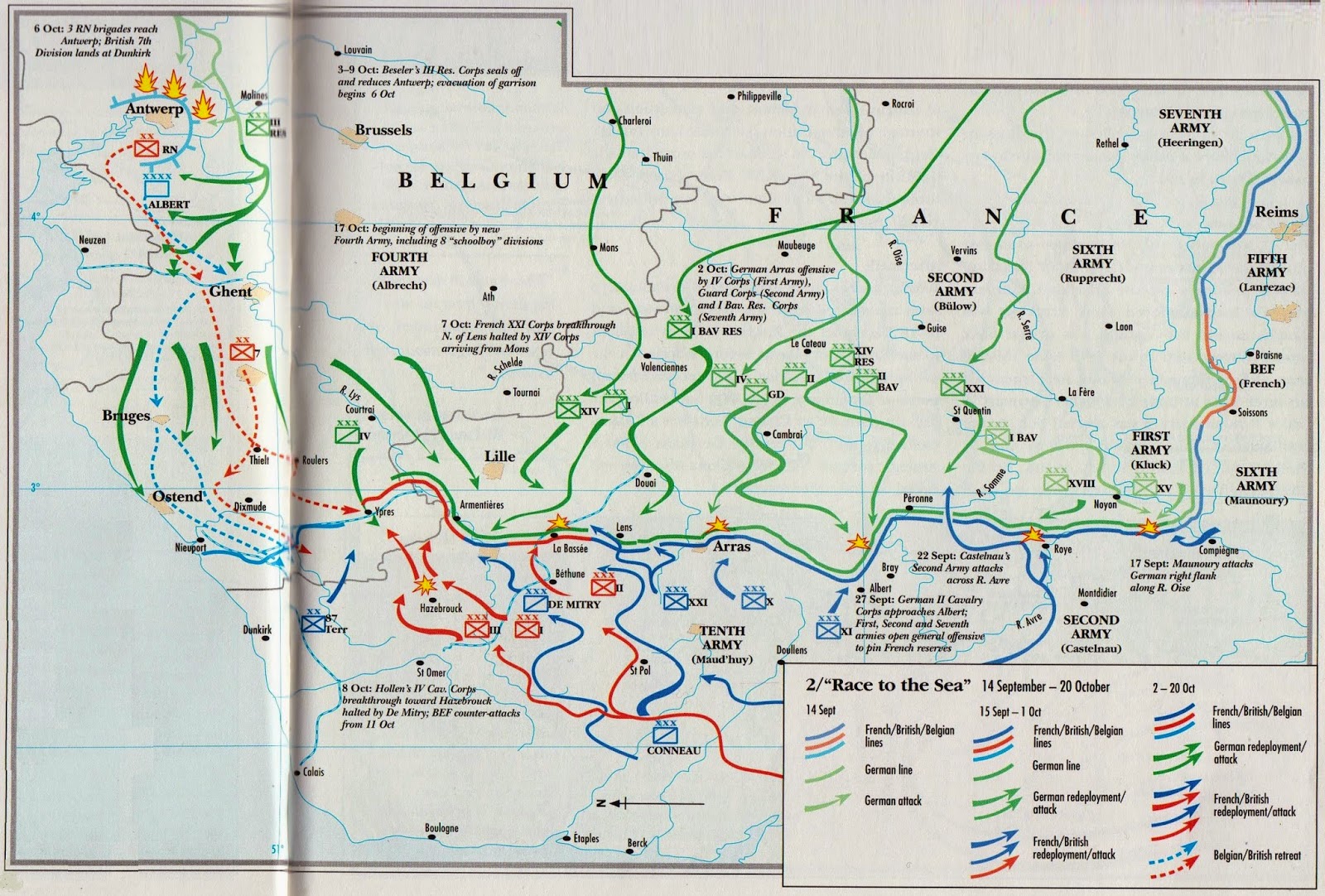 O mapa acima (atenção: está orientado para Leste, o Norte fica para a esquerda) procura sintetizar o conjunto de operações da Frente Ocidental no Outono de 1914. Os historiadores militares acabaram por as baptizar de Corrida para o mar: tendo-se enfrentado no centro de França em Setembro, na Batalha do Marne, os dois exércitos tentaram depois flanquear-se mutuamente deixando tropas em guarnição ao longo da linha de contacto. Noutros conflitos anteriores, os exércitos ter-se-iam esfarelado no processo de distribuição dos efectivos por centenas de quilómetros de frente; neste, a existência de milhões de soldados permitiu que o processo prosseguisse até ao Canal da Mancha, onde teve que terminar. Aprecie-se o percurso dessa linha traçada no mapa acima, uma linha paralela de cor verde do lado de cima (assinalando as tropas alemãs) e azul (francesas), vermelha (britânicas) ou azul clara (belgas) do outro lado. É a partir daí que a Primeira Guerra Mundial se caracteriza por ser a guerra das trincheiras. Umas trincheiras muito simples, escavadas, que, a princípio se limitavam a ser guarnecidas por tropas de infantaria, como são retratadas na fotografia abaixo. E eram as próprias circunstâncias que as levavam a assumir naturalmente um comportamento defensivo: