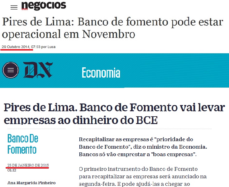 Aqueles (e todos os outros) prazos não foram cumpridos mas a partir dessa época, António Pires de Lima, que assumira entretanto a pasta da Economia em Julho de 2013, torna-se a cara mediática do projecto do Banco de Fomento. É já ele que ilustra uma notícia de Novembro de 2013 que promete um Banco de Fomento operacional a partir do primeiro semestre de 2014. Só posso especular quanto ao que aconteceu à opinião de Celeste Cardona, porque deixei de a ver publicada... A expirar aquele primeiro semestre (Junho de 2014), o Banco ainda aguardava a licença bancária do Banco de Portugal mas o Diário Económico já conseguira saber que tinha onze administradores, dos quais cinco executivos. Em Julho de 2014, Pires de Lima dava a cara à notícia que o Banco ia avançar depois do Verão. Depois do Verão, em Outubro de 2014, o presidente da comissão instaladora do Banco anunciava querer abandonar a instituição, apesar do convite do ministro Pires de Lima. Nesse mesmo mês, o ministro prometia que o Banco poderia estar operacional no mês seguinte. Não estava. Já em Janeiro deste ano (2015), ainda e sempre Pires de Lima, preparava-se para anunciar na segunda-feira seguinte o primeiro instrumento para recapitalização das empresas... Em finais de Setembro de 2015, às vésperas das eleições, apareciam finalmente 300 milhões no Banco para o capital das empresas este ano. Enfim... dá perfeitamente para perceber que a criação do Banco de Fomento foi uma grande cagada da qual resultou um grande cagalhão. Eu percebo que, quando se vai por um jardim e se encontra uma coisa dessas no meio da relva, possa haver uma certa dificuldade em identificar o autor da proeza. Agora, quando as coisas se apresentam desta forma tão bem documentada é preciso muito mais do que incompetência jornalística para, como se faz no Expresso, tentar atribuir ao idealismo de Vítor Gaspar os méritos que, a nível ministerial, vão inteiros para a obra de António Pires de Lima...