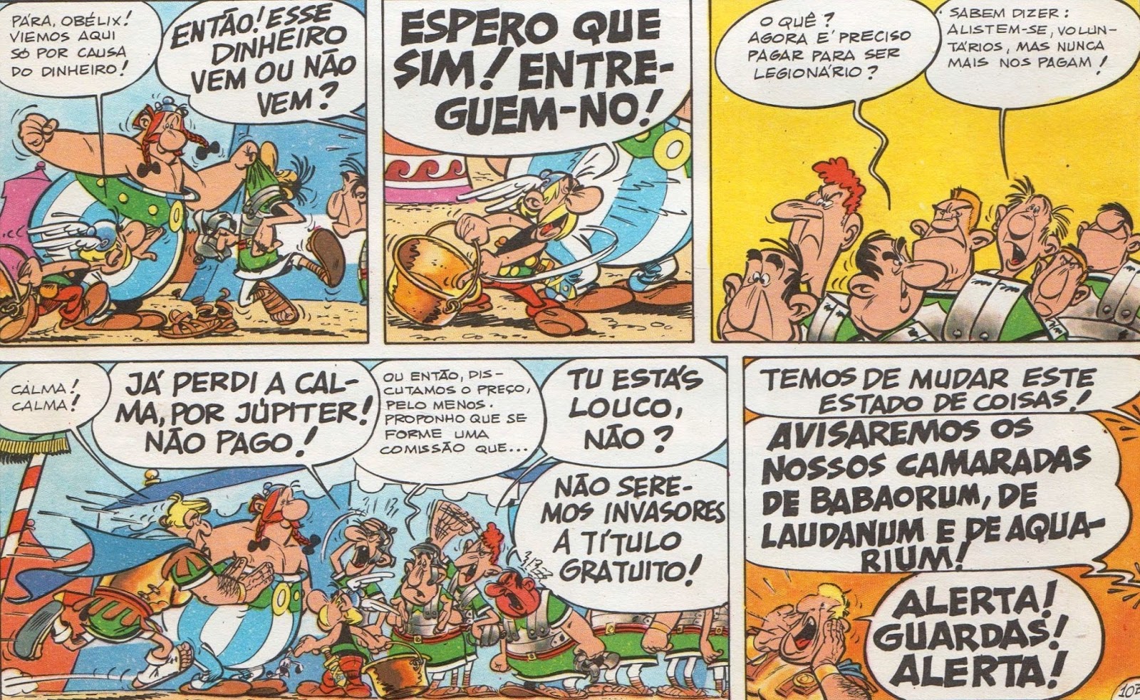 Eu adoro esta cena de Astérix e o Caldeirão. Começa por um daqueles equívocos típicos das peças do clássico Théâtre de Boulevard francês – em que sentido deve fluir o dinheiro, dos romanos para os gauleses ou vice-versa? Quem paga a quem? – mas rapidamente evolui para uma daquelas cenas de nonsense britânico clássico - o legionário que se pergunta se agora é preciso pagar para se ser legionário ou o que, conciliador, propõe a formação de uma comissão. Superior a qualquer dessas duas escolas de humor, Obélix atravessa a transição impoluto e igual a si mesmo. Como ele próprio esclarece: - Eu próprio não percebi lá muito bem, mas o Astérix explica-vos.