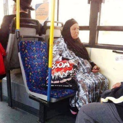 Vivem-se tempos tensos, estes, em que não sei se esta fotografia recolhida num corriqueiro autocarro israelita (veja-se o chapéu típico do passageiro à esquerda) consegue recolher os sorrisos que a ironia dos dizeres do saco de plástico merecem. Suspeito que nem mesmo o provocadoramente iconoclasta Serge Gainsbourg (1928-1991), estando vivo, se atreveria a compor agora uma outra canção de conteúdo igualmente explosivo como este Boum, Badaboum (1967), interpretado por Minouche Barelli (1947-2004), onde a sua mini saia é, só por si, uma declaração anti-islâmica.
