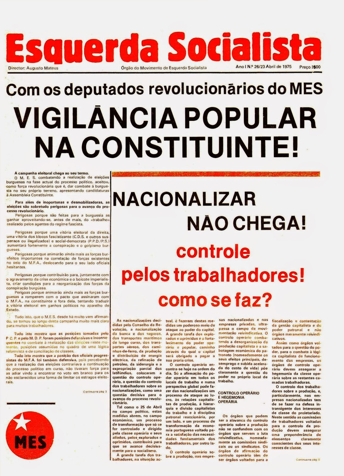 O Conselho da Revolução acaba de tomar importantes medidas de ataque ao poder dos grandes capitalistas e dos senhores das terras. Medidas que há muito se impunham e pelas quais o M.E.S. com decisão. As nacionalizações representam uma inegável vitória da luta das classes trabalhadoras em aliança com o sector progressista e revolucionário do MFA.