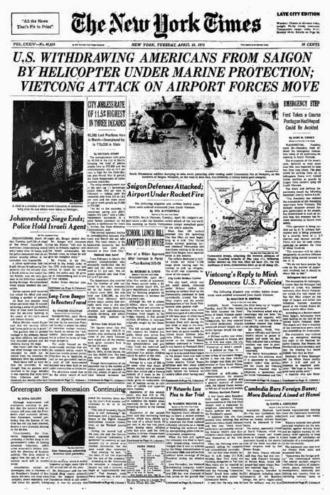 Às primeiras horas da madrugada de 30 de Abril de 1975 – completam-se hoje 40 anos – dava-se por terminado o envolvimento norte-americano no Vietname. A fotografia acima, do fotógrafo holandês Hubert van Es (1941-2009), exibindo um momento de uma evacuação por helicóptero a partir do terraço de um edifício de Saigão adquiriu o carácter simbólico de uma política externa norte-americana para uma determinada região do globo que fracassara totalmente. Mas é extremamente curioso apreciar aquilo que, nos anos que entretanto decorreram, nos Estados Unidos se tem feito para que se tenha vindo a alterar essa percepção simbólica. O processo da evacuação dos norte-americanos e dos sul-vietnamitas que lhes eram afectos recebera o nome de uma operação militar. Isso foi um pormenor que, na altura, não teve qualquer interesse: aprecie-se abaixo a edição do New York Times em que a evacuação é noticiada e onde o nome da Operação não aparece evocado sequer.