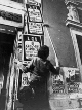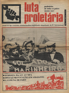 Lacuna grave na minha revisitaçãode Abril deste anoàs grandes organizações da esquerda revolucionária do PREC (e que aqui e agora procuro colmatar) foi a omissão à referência à Liga Comunista Internacionalista. O jornal da Liga intitulava-se Luta Proletária (abaixo) mas a militância da organização seria dominada pela intelectualidade e não pelo proletariado. É por isso simbólico que, na foto supra, aquilo que mais se destaca do instantâneo será a luta do militante (um intelectual), não contra a burguesia, mas contra a cola, a brocha e os cartazes, com resultados que, pelo seu encavalitamento e pela sua inclinação (cada vez mais) acentuada, decerto decepcionariam o camarada Trotsky.
