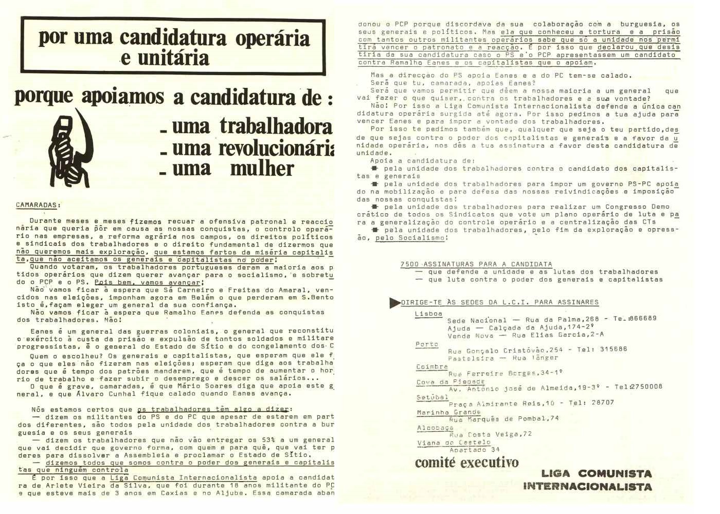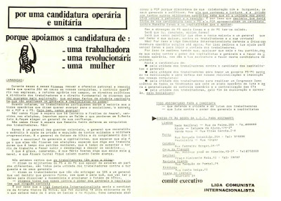 As eleições presidenciais francesas que se realizaram em Maio de 1974 (no mês seguinte ao 25 de Abril, portanto) ficaram marcadas, entre outros pormenores, pelo aparecimento de uma primeira candidata presidencial, a sindicalista trotskista Arlette Laguiller, então com 34 anos. E que não se saiu nada mal no primeiro turno dessas eleições, recebendo quase 600.000 votos, o correspondente a 2,33% da votação (acima). Dois anos passados e inspirados na ideia e no seu sucesso, os trotskistas cá do sítio lembraram-se de a tentar reproduzir por ocasião das eleições presidenciais portuguesas de Junho de 1976. O trotskismo cá no burgo era representado por duas organizações: a LCI (Liga Comunista Internacionalista), a que aqui me referi ainda recentemente, e o PRT (Partido Revolucionário dos Trabalhadores).