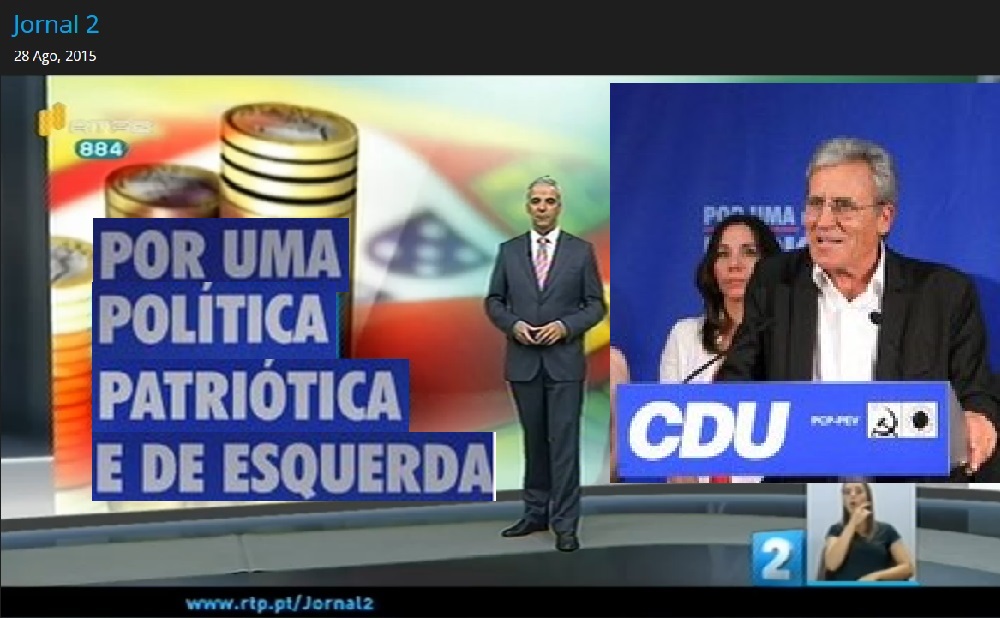Acorde-se que a imagem supra bem poderia ser aproveitada para um cartaz da coligação ou então tornar-se um trecho subliminar para os seus tempos de antena da próxima campanha eleitoral. Mas não. Trata-se apenas uma passagem do telejornal da RTP2 de anteontem, 28 de Agosto de 2015. Dizer que a imagem de Pedro Passos Coelho recebe ali um tratamento favorecido é um understatement. Imagine-se, por momentos e para comparação, se seria possível que Jerónimo de Sousa fosse apresentado antes de uma qualquer notícia expectável por uma fotografia igualmente sorridente e simpática enquadrada por detrás também pelo escudo nacional e, já agora, pela foice e pelo martelo... O mais interessante será porém que a notícia que serve de pretexto para tal boneco tem muito pouco a ver com o investir no interior e se revela afinal uma não notícia porque, nas palavras do próprio apresentador João Fernando Ramos, o primeiro-ministro recusa fazer cenários do governo até às eleições ou, como surgiu em rodapé (cerca dos 21 minutos de telejornal), Passos não fala dos “compromissos” de Cavaco. O microfone surgiu diante de Passos Coelho para que ele dissesse que não dizia nada...