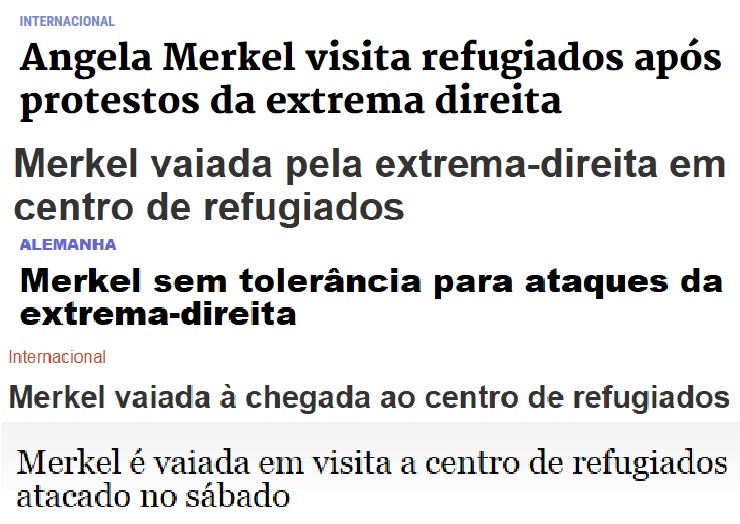 Angela Merkel visitou ontem um centro de refugiados e foi recebida com vaias de um grupo que a imprensa internacional (e a portuguesa por arrasto, aprecie-se o conjunto de cabeçalhos acima) não hesitou em qualificar de extrema-direita e em quantificar em cerca de 50 pessoas. O que me intriga é porque será que, por cá, já se tendo instalado uma tradição de fazer esperas aos governantes para os vaiar (fossem eles do PS, sejam eles agora do PSD/CDS), não me lembro que haja a mesma preocupação por parte da nossa imprensa em destacar as afinidades ideológicas de quem vaia (que sabemos normalmente próximos do PCP - a extrema-esquerda) nem em procurar ser-se mais rigoroso quanto ao número dos que o fazem (algumas dezenas, uma meia centena)...