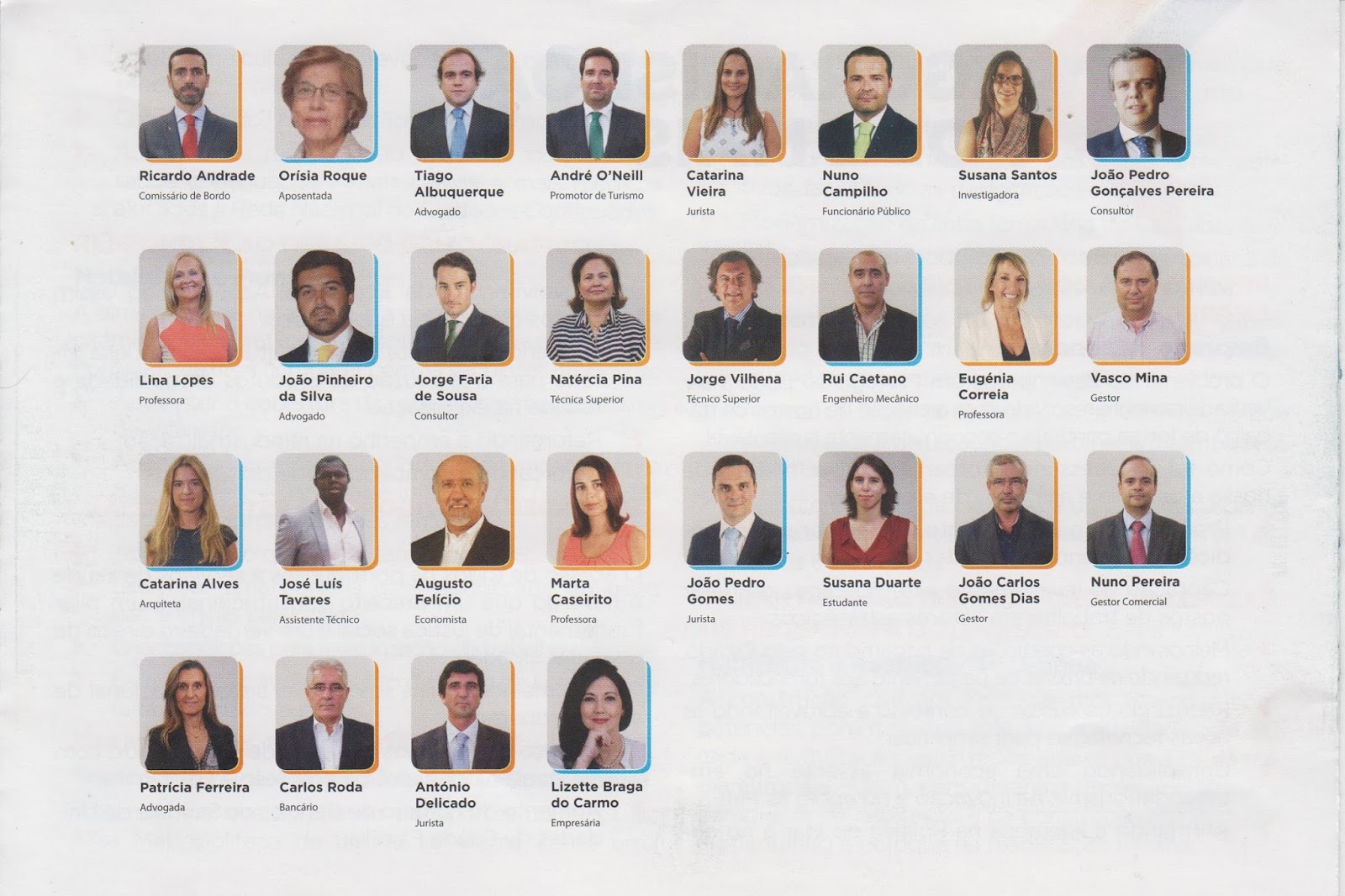 Contém 52 nomes. Há ali 8 advogados, 6 gestores, 6 juristas, 4 professores, 3 técnicos superiores, 3 consultores, 2 funcionários públicos, 2 médicos, 2 economistas, 2 bancários, 2 deputados(! – não sabia que o cargo já se profissionalizou...) e 1 de cada uma das seguintes profissões: professor universitário, assistente notarial, comissário de bordo, aposentado, promotor de turismo, investigador, engenheiro mecânico, arquitecto, assistente técnico, estudante, gestor comercial e, atenção, 1 mas só 1 empresário, um paradoxo para quem tanto proclamou as virtudes do empreendedorismo.