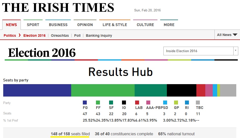 Mais de 48 horas depois do encerramento das urnas das eleições legislativas irlandesas ainda não há resultados completos sobre a composição do futuro parlamento. Ainda restam 10 lugares (7% do Dáil) por preencher por causa da complexidade do sistema adoptado, o voto único transferível. É um sistema que consegue combinar as vantagens da representação proporcional e da votação por lista partidária, mas com a possibilidade do eleitor hierarquizar a ordem por que deseja que os membros da lista sejam eleitos. Melhor, nesse processo de hierarquização o eleitor pode personalizar as suas escolhas sem adoptar qualquer fidelidade partidária. O sistema mostra-se também amigável para com as candidaturas independentes (como se pode ler acima, há 20 deputados independentes eleitos). Com tantos predicados, o senão do sistema é, para que tudo isso seja possível, o processo de escrutínio é complicado e muito moroso. E, pelos padrões da comunicação social moderna, não se consegue gerir uma espectativa que se arraste assim por mais de dois dias - a não ser que se trate da eleição de um papa ou então da noite dos óscares. Com a sobreposição destes dois eventos (as eleições irlandesas e os óscares), quando terminar o escrutínio desconfio que já ninguém se lembrará onde foram as eleições.