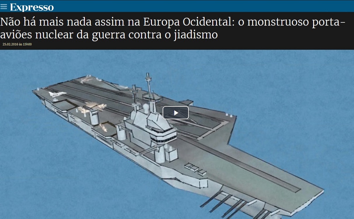 Retirada de uma página do Expresso on-line, onde a vedeta é o porta-aviões francês Charles de Gaulle (por acaso, um vaso de guerra com um historial cheio de problemas técnicos...), esta forma tão infantil de o apresentar em todas as suas performances como elemento de combate relevante da guerra contra o jiadismo, chega a ser agressivo para a inteligência do leitor razoavelmente informado. É que os problemas que grassam no Próximo Oriente são assaz complexos e a luta contra uma das facções intervenientes não se pode reduzir a (mais) um episódio da saga Star Wars... Que se saiba, e para exemplo do disparate, o Charles de Gaulle não pode navegar pelo Sena acima, até Paris. Numa outra perspectiva da infantilização do conflito, em que é que este exercício do Expresso difere substantivamente do de Donald Trump, quando este usou a referência da personagem de Harrison Ford em Air Force One para referir perfis presidenciais?...