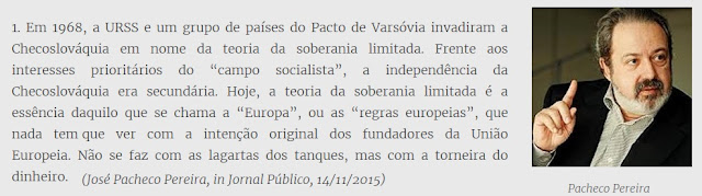 Este vídeo com um trecho de um discurso de Paulo Rangel no parlamento europeu terá sido difundido com outro objectivo, mas a forma como o europeísmo é invocado e mesmo brandido pelo orador faz-me lembrar as ortodoxias dos tempos das grandes guerras religiosas ou as profissões de fé pelas doutrinas totalitárias do Século XX. A Europa e o europeísmo, pelo misticismo como Rangel a eles se refere, assemelham-se estranhamente à Nação de uns ou então ao Comunismo dos outros. O europeísmo de Rangel parece revestir-se de uma concepção tão rígida que não surpreenderia muito (se levarmos a sério as suas palavras) vir-se a falar a breve futuro de uma cisão franco-alemã como outrora se falou de uma sino-soviética. Já agora e a propósito e quanto ao resto da intervenção malevolente de Paulo Rangel, a comparação de Porfírio Silva da União Europeia com a União Soviética e que ele condena nem sequer é original: já há três meses José Pacheco Pereira fizera uma analogia semelhante, senão até mais substantiva e contundente (abaixo), comparando a soberania dos actuais países da União Monetária com a dos países do Pacto de Varsóvia, submetidos à famosa Doutrina Brejnev.