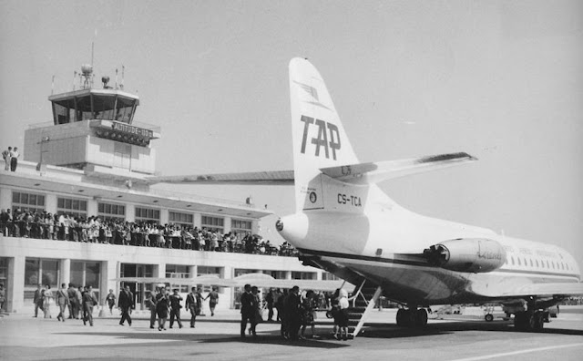 Fotografias de um embarque e de um desembarque no aeroporto da Portela há cerca de uns cinquenta anos. O avião é um SE 210 Caravelle dos TAP (como então se dizia, respeitando o plural da sigla: TAP = Transportes Aéreos Portugueses), por cá aportuguesado para Caravela. Ainda ontem fui esperar alguém ao aeroporto e as coisas não se passaram com esta magnificência... Os tempos estão bastante mudados.