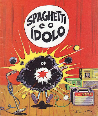 Spaghetti e o Ídolo é uma história de BD concebida por Attanasio e Goscinny. Spaghetti é um herói para o qual o genial René Goscinny também escreveu argumentos. Sem terem o reconhecimento artístico (e o volume de vendas...) das aventuras de Asterix ou de Lucky Luke, as de Spaghetti (que é acompanhado pelo seu estúpido e persistente primo, conhecido em Portugal por Pomodoro) também produziram alguns momentos que considero emblemáticos, como é o caso da imagem final desta história, aparecida em 1964, por ocasião da eclosão do fenómeno de popularidade exuberante que acompanhava os The Beatles e outras bandas afins.