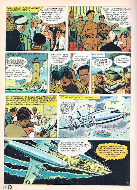 18 de Abril de 1968. O mês seguinte iria ser pleno de significado em França, mas isso ainda não se sabia quando da edição do número 1017 da revista Tintin francesa. Nela se incluía esta pequena história realista de quatro páginas sobre o assalto ao paquete português que tivera lugar em Janeiro de 1961. Apesar de necessariamente sucinta, de rebaptizar Henrique Galvão de Galveo e de nela se dar relevo desnecessário a uma proeza menor de um artista francês chamado Gil Delamare, ali armado em jornalista, o conteúdo da narrativa acaba por ser surpreendentemente equilibrado. Mas isso não quereria dizer que uma história como a do Santa Maria poderia aparecer na edição portuguesa dessa mesma revista Tintin, cujo primeiro número iria aparecer dali por seis semanas, a 1 de Junho de 1968.