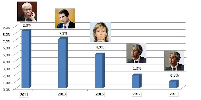 Nascido numa época em que me convenceram do quão importante era a questão de reduzir e manter no mínimo o défice das contas públicas, nasceu este meu hábito de, de dois em dois anos, ir mantendo e publicando um gráfico com o resultado do défice orçamental a meio do ano (a meio do ano por razões que aqui expliquei), encimado pela fotografia do responsável pelas finanças da época e, concomitantemente, também responsável pelo resultado exibido. Eu bem sei que publicá-lo nesta altura resulta favorável para o PS mas, já que, em 2011, me convenceram da indispensabilidade do controle das contas públicas, esta é uma daquelas tradições de que não quero abdicar - note-se que, o último resultado aqui apresentado, há dois anos, em Setembro de 2015, também propiciava uma imagem favorável do desempenho de Maria Luís Albuquerque em vésperas de outras eleições. Mas, para que o efeito da notícia saia mais neutro, decidi fazer a ligação à notícia do Observador que dá conta dos 0,8% registados no primeiro semestre deste ano; a interpretação e redacção que o jornal dá aos resultados, o ênfase que põe no desvio causado pela capitalização do Novo Banco, neutraliza tudo aquilo de positivo que se possa depreender do gráfico acima.