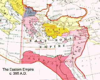 Suspeito que haverá alguns professores maldosos no Brasil que encarregaram os seus alunos de fazer trabalhos sobre as religiões existentes nos territórios que outrora formaram o Império Romano do Oriente. Não exagerarei quando disser que já encontrei pelo menos uma dezena de visitantes que aqui vieram ao blogue à procura especificamente dessa informação. E, em atenção a essas variadas famílias brasileiras aí vai uma pequena história do Império Romano do Oriente e das suas religiões actuais.Se a história é – como qualquer poste de blogue – necessariamente breve, a duração do Império não o é. O Império Romano do Oriente, que corresponde à metade oriental do Império Romano conforme se observa no primeiro mapa, teve uma duração que superou os 1.000 anos: de 395 d.C. até 1453 d.C. Para os padrões medievais europeus era um estado de uma complexidade e sofisticação muito avançada, assente em três parâmetros identificativos: direito romano, cultura grega e religião cristã ortodoxa.