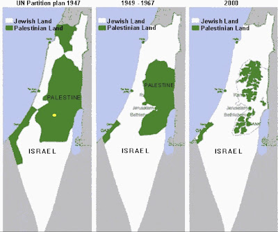 Actualmente, este último gesto popularizou-se, com o aproveitamento do tempo de antena para a passagem de mensagens televisivas sobre simplificadas (ver deste blogue o poste O Peclec, o Sigic, o Nuno e o Melo) ou, envolvendo bonecos, para brandir mapas que representam uma análise estratégica profunda, como fez Daniel Oliveira com aquele mapa mais abaixo (também inserido no seu blogue), na sua aparição no Eixo do Mal da SIC Notícias.A intenção clara do encadeamento de três configurações fronteiriças da Palestina em três datas distintas (1947, 1949-1967, 2000) é a de nos induzir visualmente a ideia que o território concedido aos palestinianos tem vindo a reduzir-se progressivamente. Ora, para deles se poder extrair essa conclusão, então aqueles três mapas deveriam representar realidades compatíveis, o que não é verdade, para além de qualquer deles necessitar de notas explicativas...
