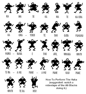 Haka, um espectáculo dentro de outro espectáculo. Trata-se de uma dança guerreira executada pela equipa neozelandesa no centro do campo, diante dos adversários, antes do jogo se realizar. Foi um ritual importado directamente do folclore maori, os polinésios que habitavam a Nova Zelândia antes do povoamento por europeus do século XIX.
